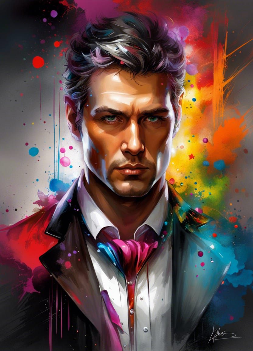 A vibrant digital painting of a handsome doctor. The artwork features expressive colors and a fractured, eclectic style, creating an enchanting and visually striking image.