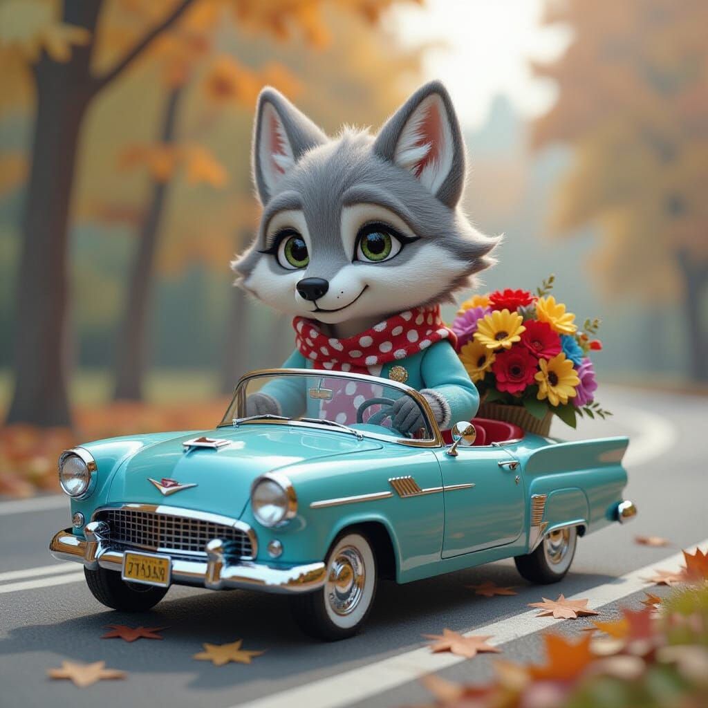 A whimsical and enchanting cute wolf driving a cute convertible toy car in a toy ring road. with large expressive cute eyes, dressed in a unique outfit of baroque polka doted attire and intriguing scarf . a flower bouquet besides him.pale colors, autumn scenery , fallen leafs all around, sharp focus, ...