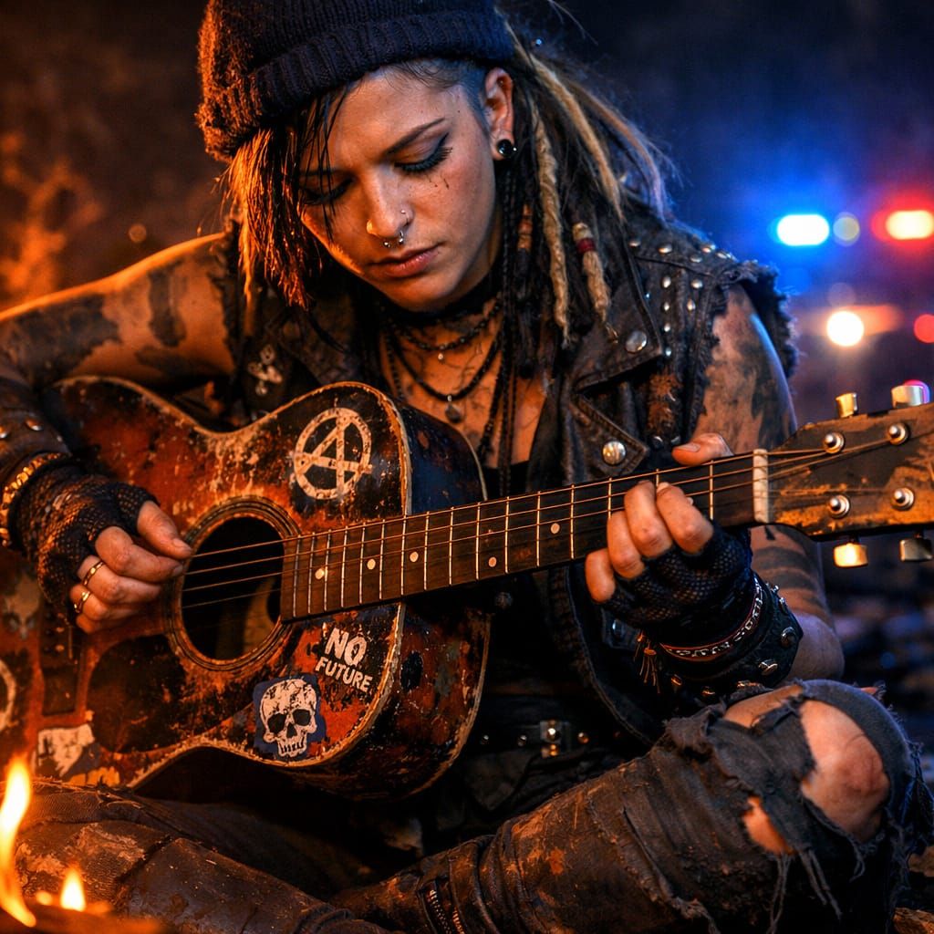 This image shows a detailed digital illustration of a street musician playing guitar by firelight. The scene features a gritty, realistic style with vibrant colors and emotional intensity.