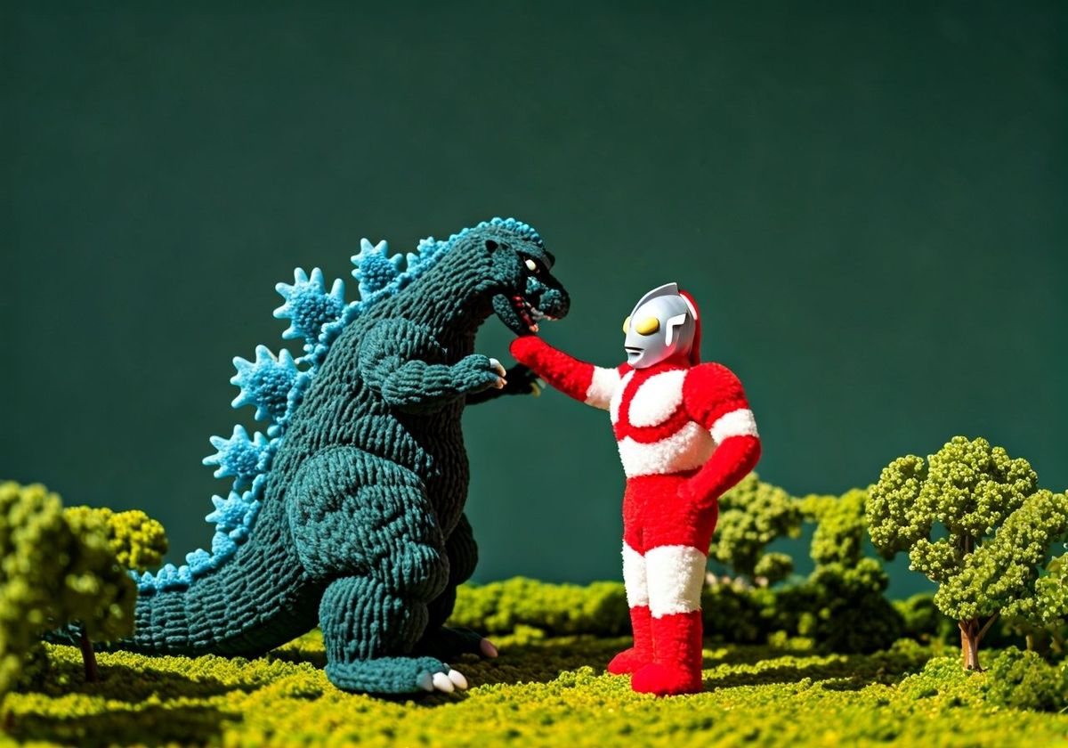 This image shows a whimsical battle between Godzilla and Ultraman, both crafted from colorful pom poms. The scene is set in a miniature urban landscape with a playful, handcrafted aesthetic.