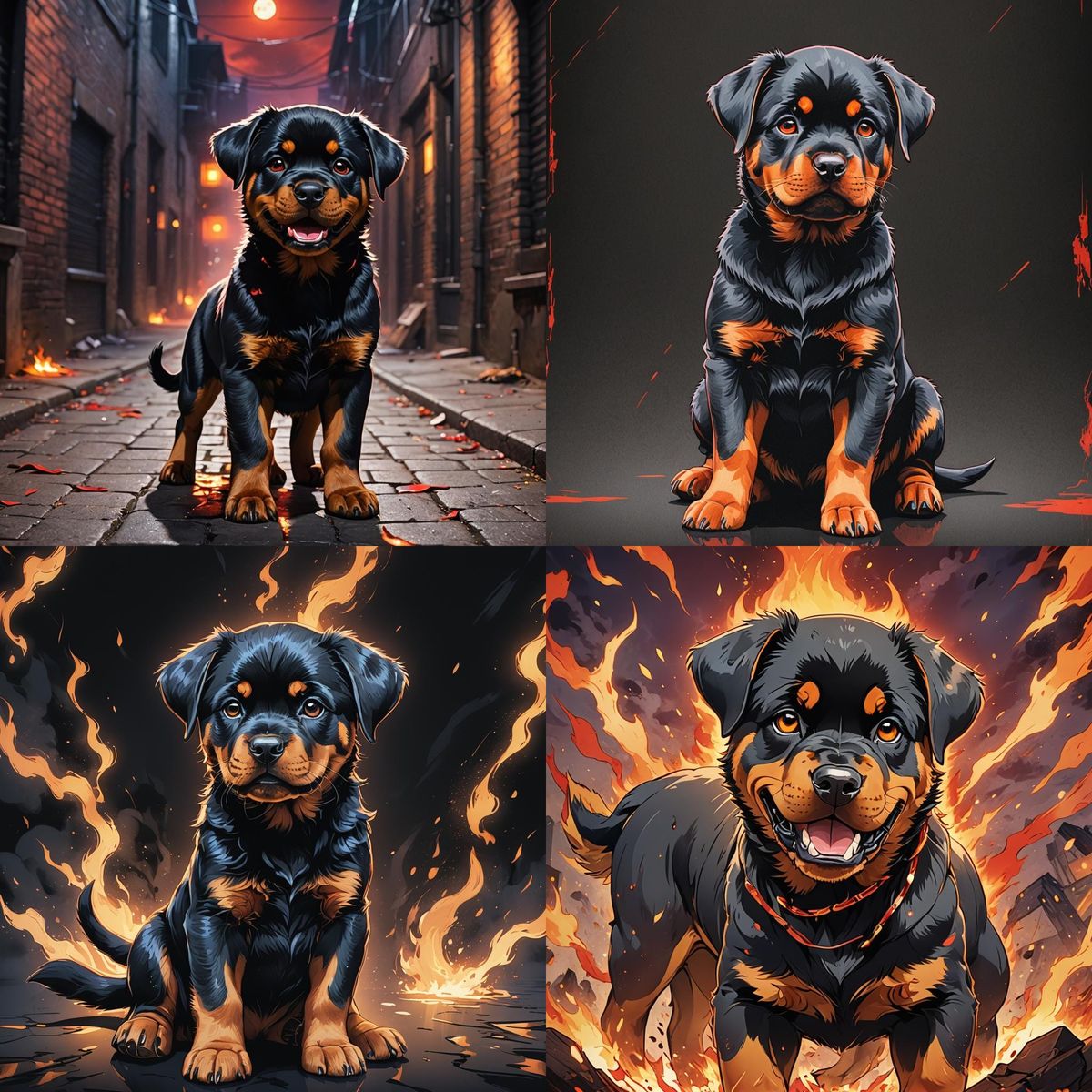 This image shows a cel-shaded hell-hound rottweiler puppy rendered in a manga or anime style. The digital artwork features cinematic lighting and deep, rich colors.