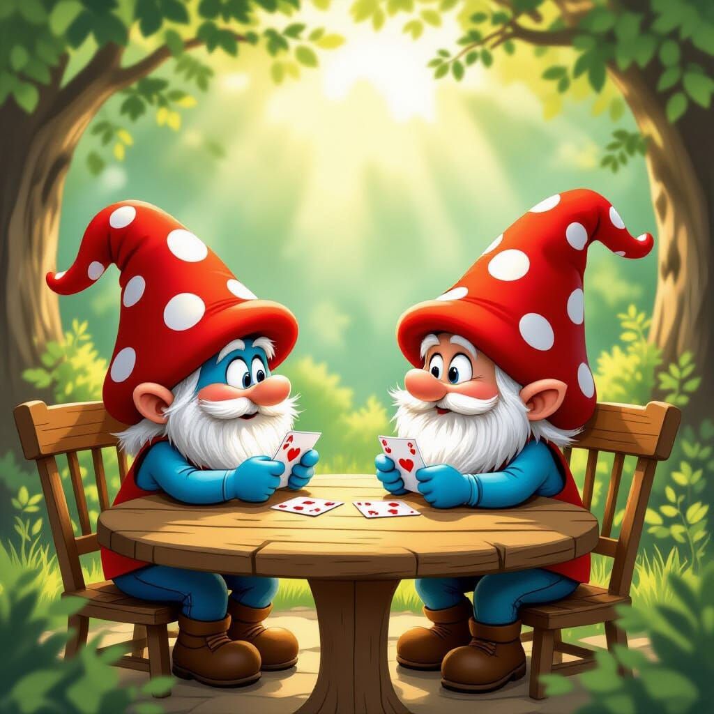 This whimsical illustration depicts a Smurf and a gnome engaged in a card game, both sporting charming red and white polka dot mushroom hats. The art style is reminiscent of storybook illustrations with fantasy elements.