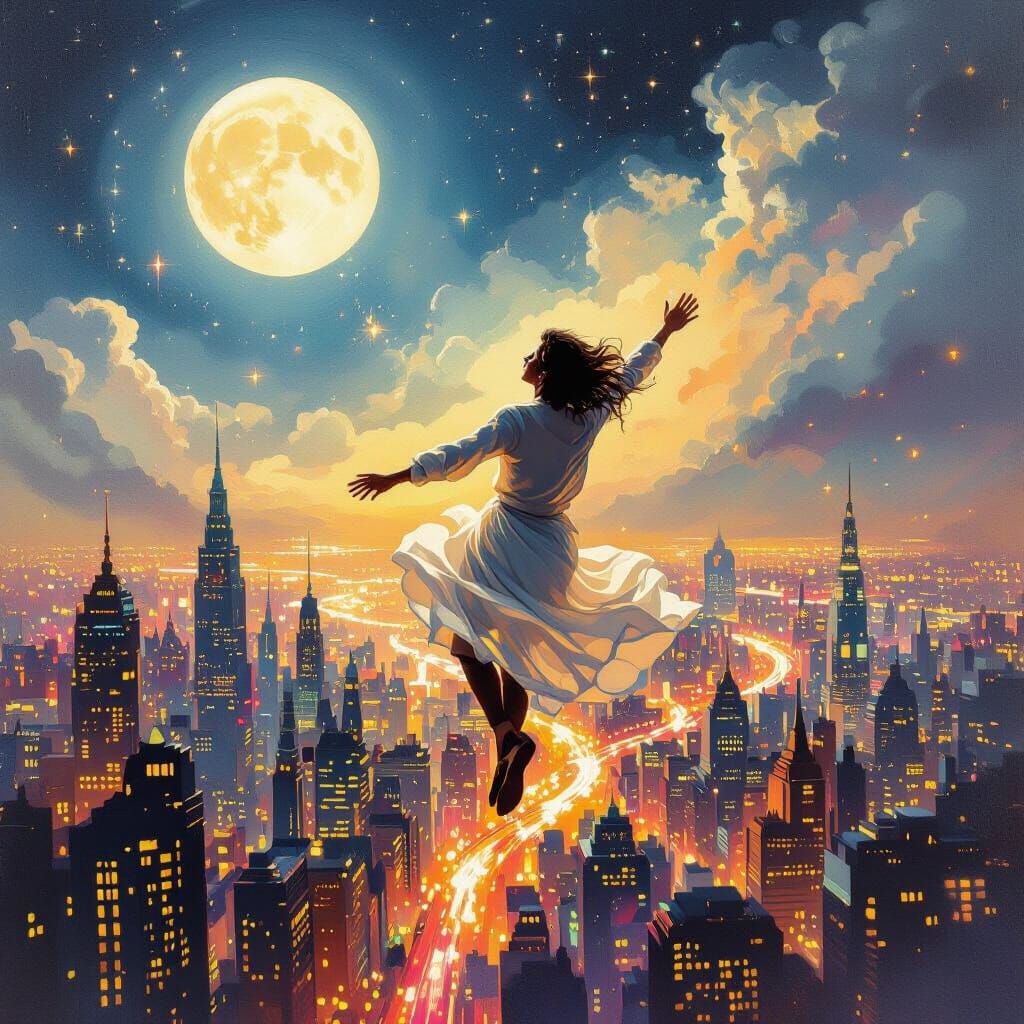 This surrealist oil painting depicts a person flying in euphoria over a glowing city at night under a full moon. Inspired by dreamlike art, it uses fluid brushstrokes and dramatic lighting to convey exhilaration and freedom.