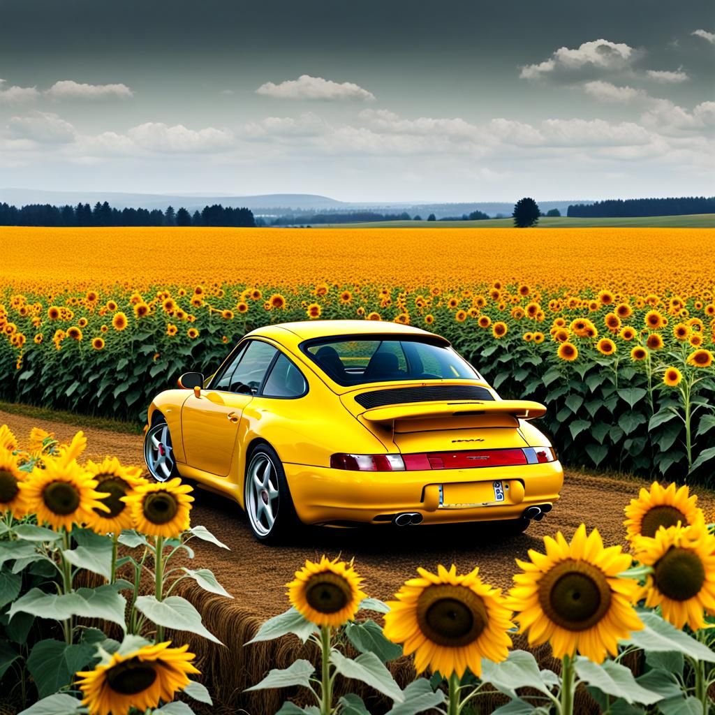 This image shows a yellow 1997 Porsche 993 with a spoiler, lowered, and positioned in a field of sunflowers. The artwork features complementary colors and fine details.