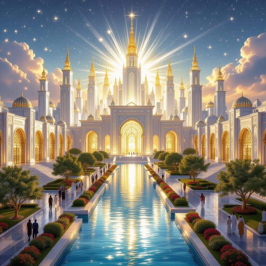 Easily generate your own stunning images of heavenly cities, streets of gold, and divine light with our free AI tool.