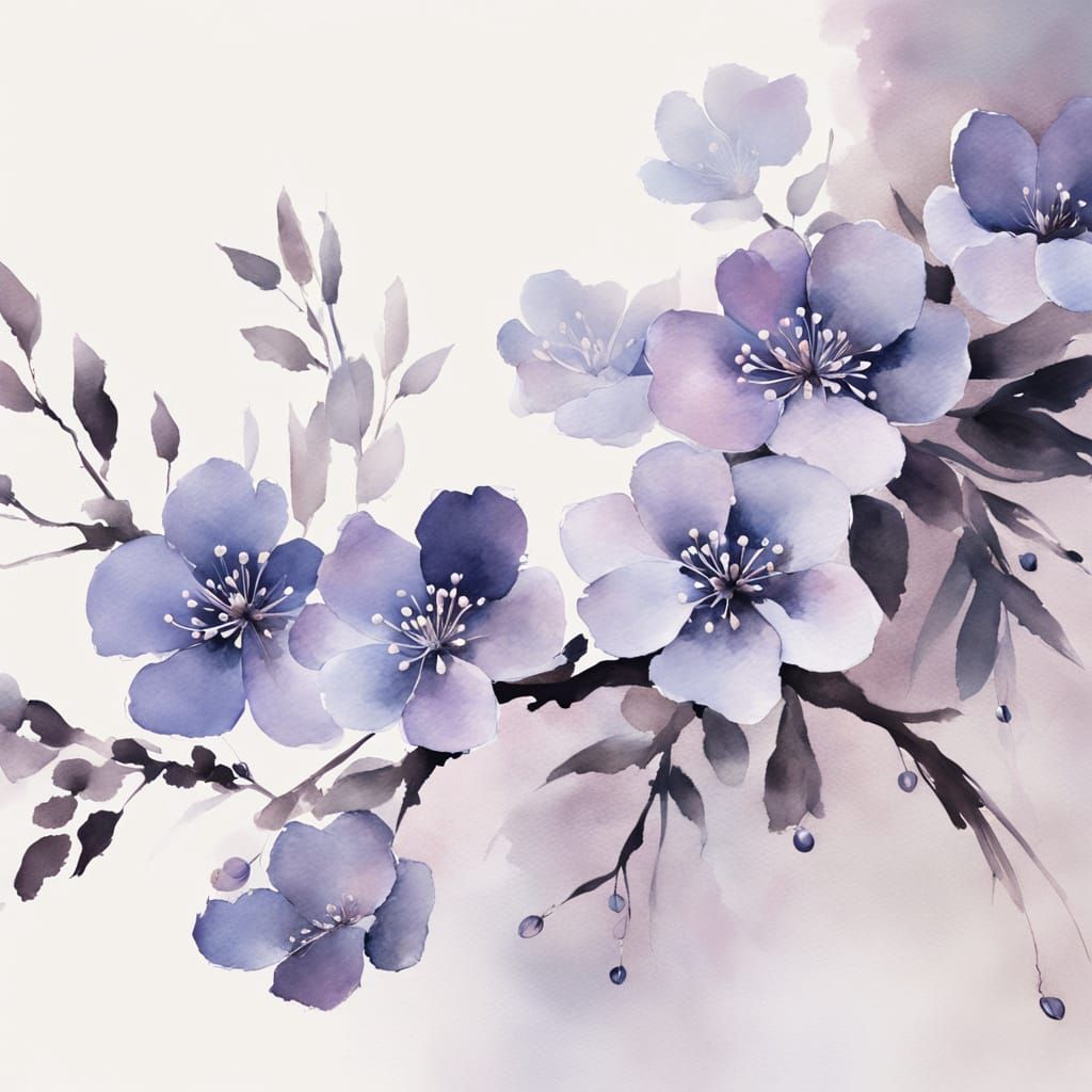 This image shows a young Asian man with short dark hair and a gentle expression, rendered in a watercolor and ink style. The background features abstract floral forms and soft, tranquil lighting.