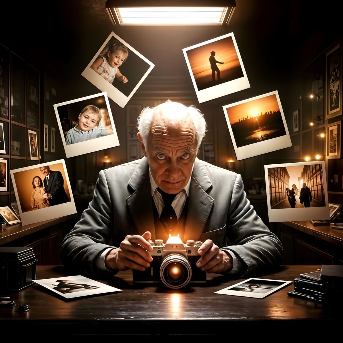 This image shows an elderly photographer in a darkroom, surrounded by floating photographs. The photos capture diverse human stories illuminated by warm, cinematic light, rendered with painterly realism and rich textures.