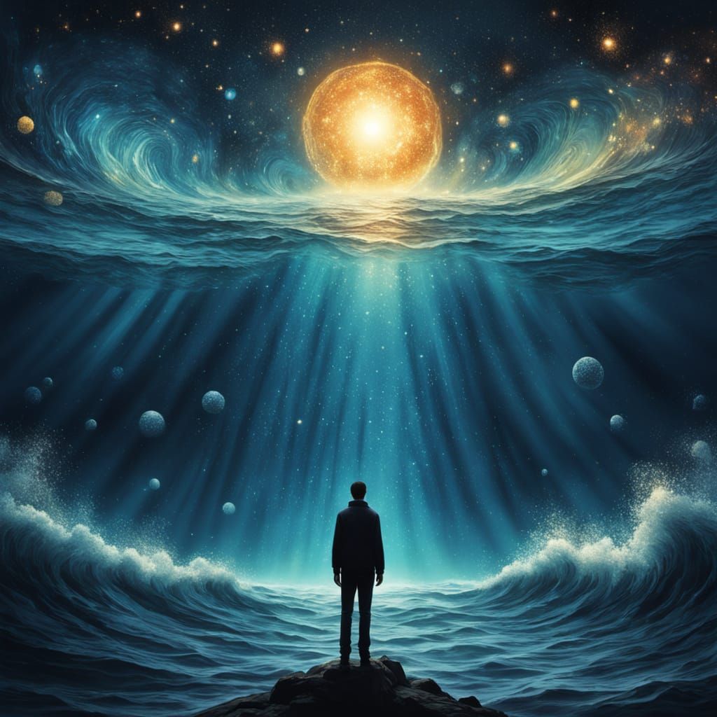 This image shows a glowing human silhouette in a deep ocean, head filled with galaxies. Dreamlike and painterly, it features shimmering blue waves and a golden divine glow above, rendered in vibrant cosmic colors.