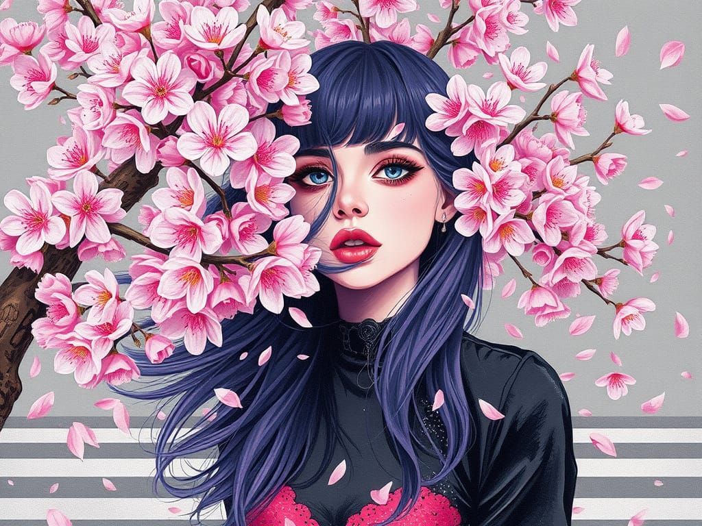 This image shows a pastel goth woman in a surreal, whimsical scene. Cherry blossoms and a checkerboard floor add to the glitch punk aesthetic of this 3D chalk art.