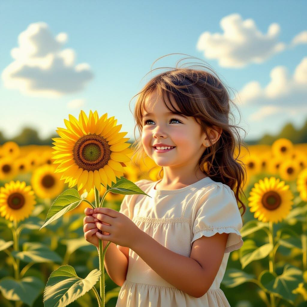 A young girl with a joyful expression holds a vibrant sunflower in a field of sunflowers under golden hour light. Rendered in an impressionistic oil painting style with textured brushstrokes.