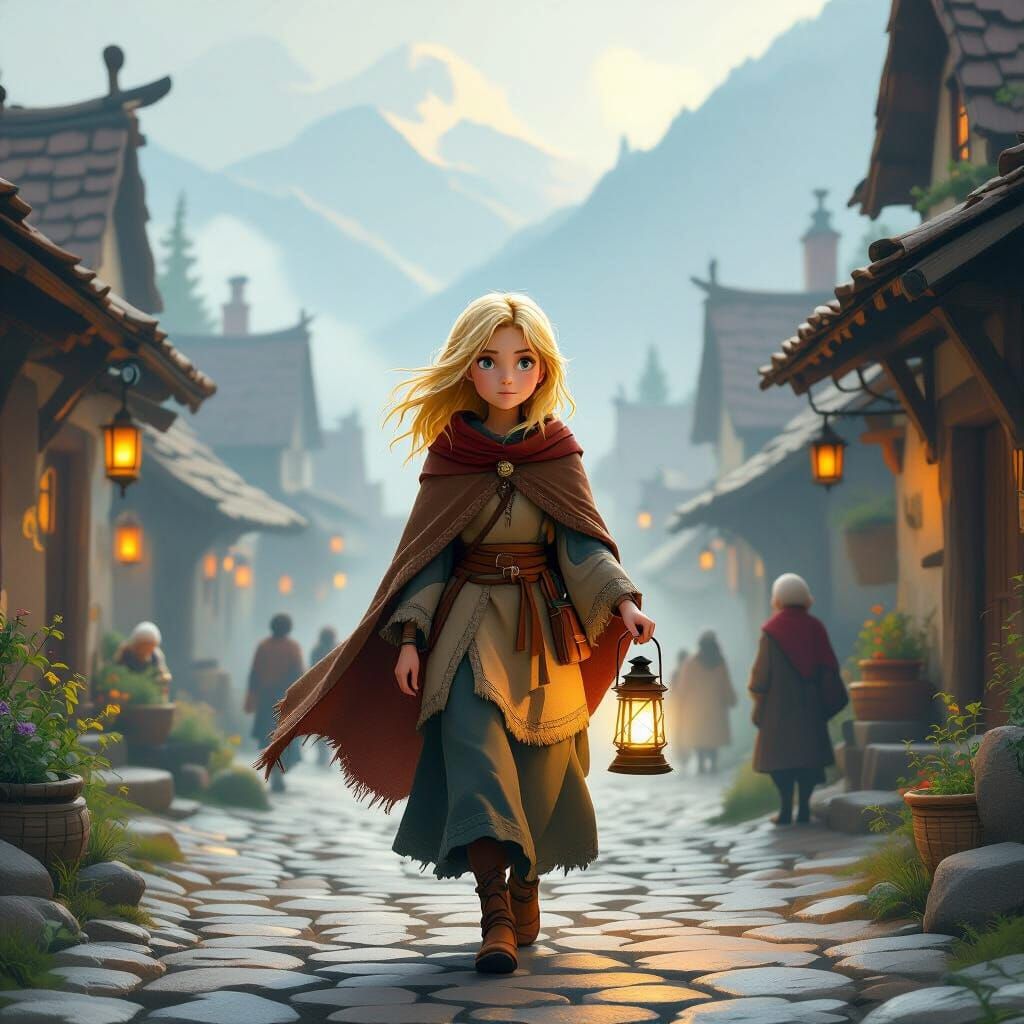A scenic image of Kara, a blonde girl, walking through a misty mountain village with cobblestone streets and bustling villagers. The scene is rendered in a painterly, cinematic fantasy style with vibrant colors and soft morning light.