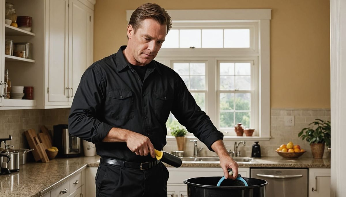 This image depicts a solitary man dressed entirely in black, diligently performing various household tasks. The scene focuses on domestic labor.