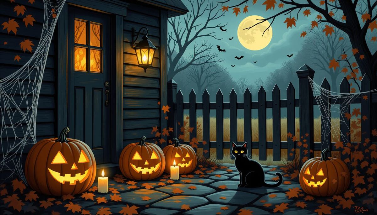 This image depicts a cozy autumn yard at dusk, featuring carved pumpkins, flickering candles, and cobwebs. A black cat with glowing eyes sits by the door, bathed in eerie lantern light and swirling leaves, rendered in a dark fantasy style.