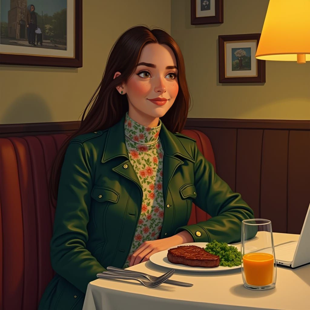 "A cartoon of a modestly dressed woman sitting in a cozy, softly lit restaurant booth at night. She has natural facial features with a warm smile, long brown hair, and soft makeup, leaning more towards realism than cartoon style. She wears a closed green leather jacket over a high-neck floral dress, showing no cleavage or revealing areas. On the table in front of her: a steak with vegetables, a glass of orange juice with a straw, a quilted beige handbag, and a white laptop. The ..."