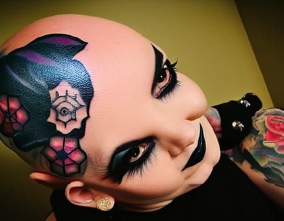 This image shows a bald gothic witch with tattoos on her head, rendered in bright daylight using gouache and watercolor techniques. The artwork has a distinct painterly aesthetic.