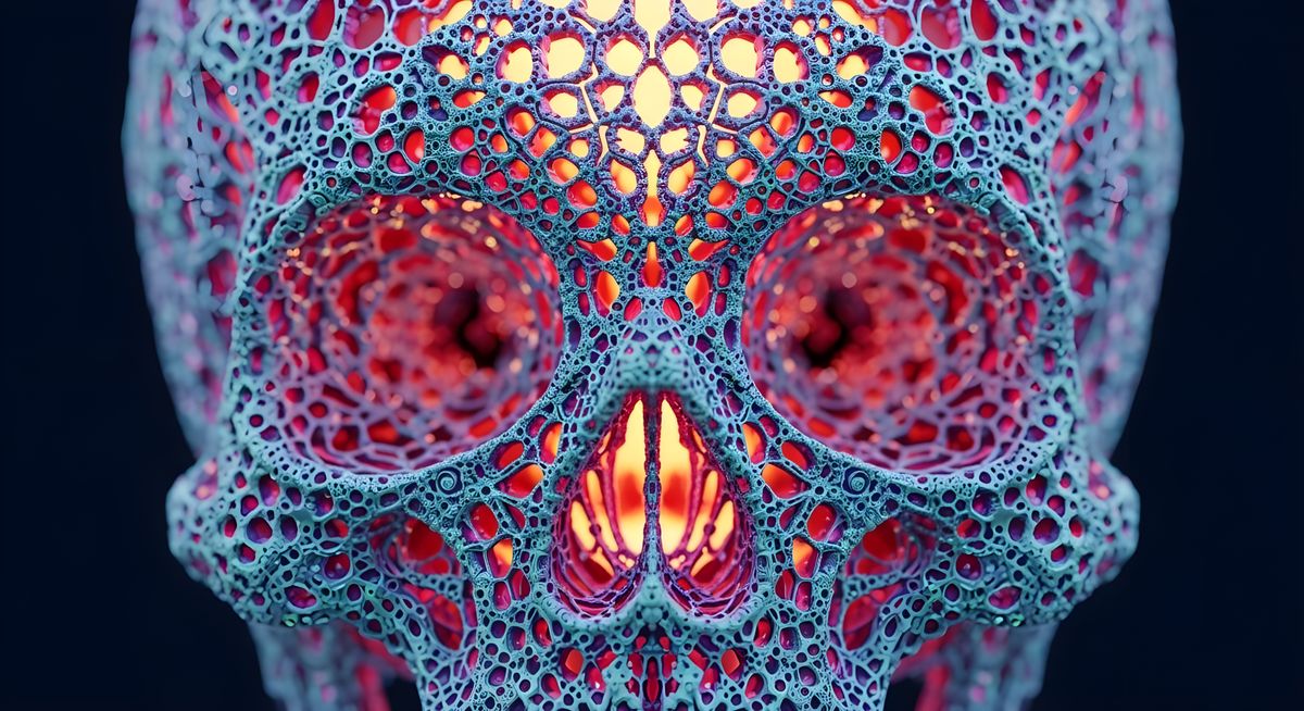 A detailed 3D scientific illustration of a vibrant neon skull, featuring depth of field and volumetric lighting. This maximalist photoillustration is intricately composed with elegant, expansive detail.