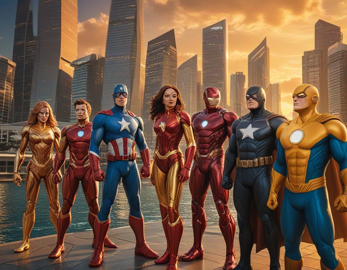 This image shows Marvel superheroes convening at Marina Bay Sands. The composition features a vibrant comic book aesthetic, dynamic shading, and cinematic golden hour lighting against a futuristic cityscape.