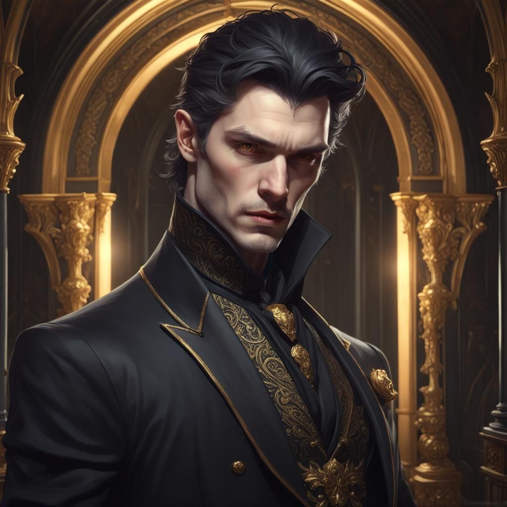 A striking picture of a handsome vampire lord in a gothic setting. The portrait features intricate details, dynamic lighting, and a carefully shaped face, rendered as trending digital art.