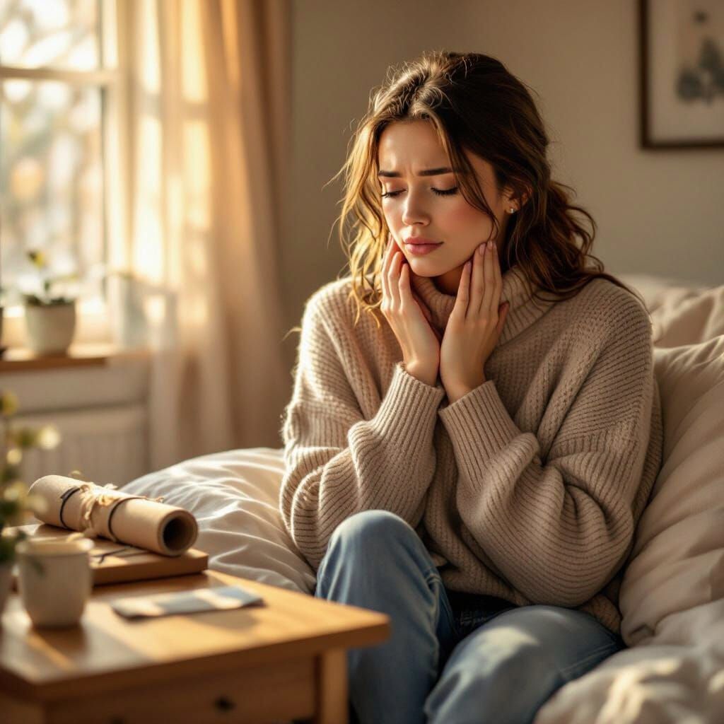 A young woman in casual wear sits in bed, hands in pain, looking at yoga equipment. The scene is bathed in soft morning light, capturing a moment of emotive realism.