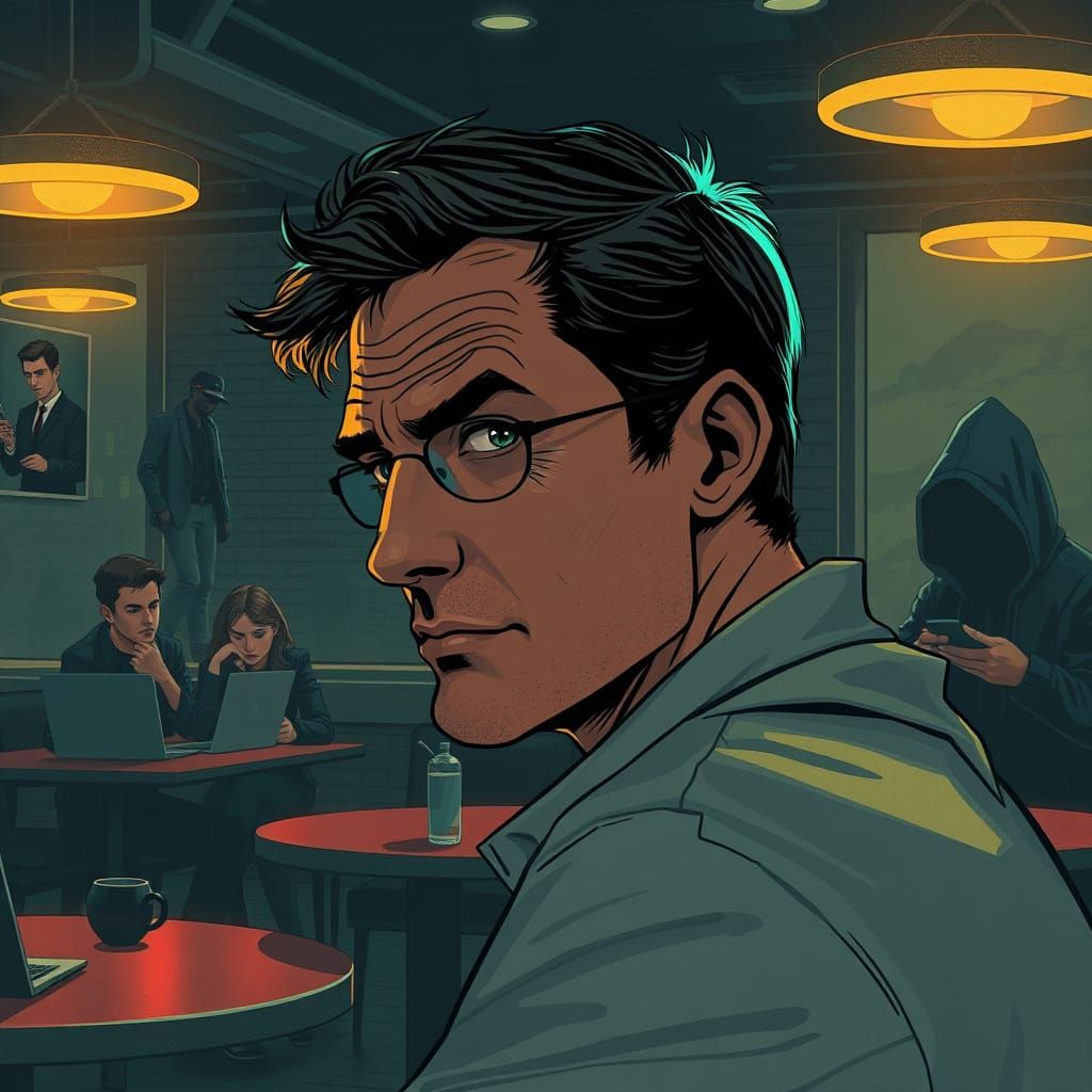 A dimly lit café scene features a man warily observing his surroundings. His gaze shifts between college students, a businessman, and a hooded figure, all rendered in a neon-noir aesthetic.