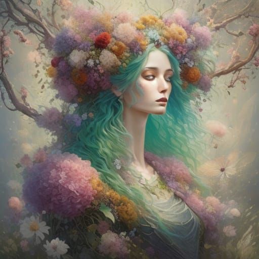 This image shows a woman with hair made of flowers and a body of petals. It is a vibrant, surreal illustration with intricate botanical details and soft textures in pastel colors.