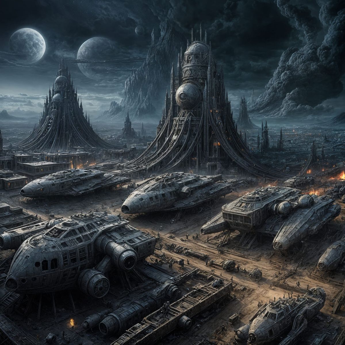 colossal ruined junkyard full of damaged old rusty hollow anunnaki space dreadnoughts with shot out parts,parts scattered across mesa landscape, night, psychedelic, by Susan Seddon Boulet, h.r. giger vlaho bukovac, leonardo da vinci, Donald Southam Lawrence, Rolf Armstrong , ultra quality perfect epic ...