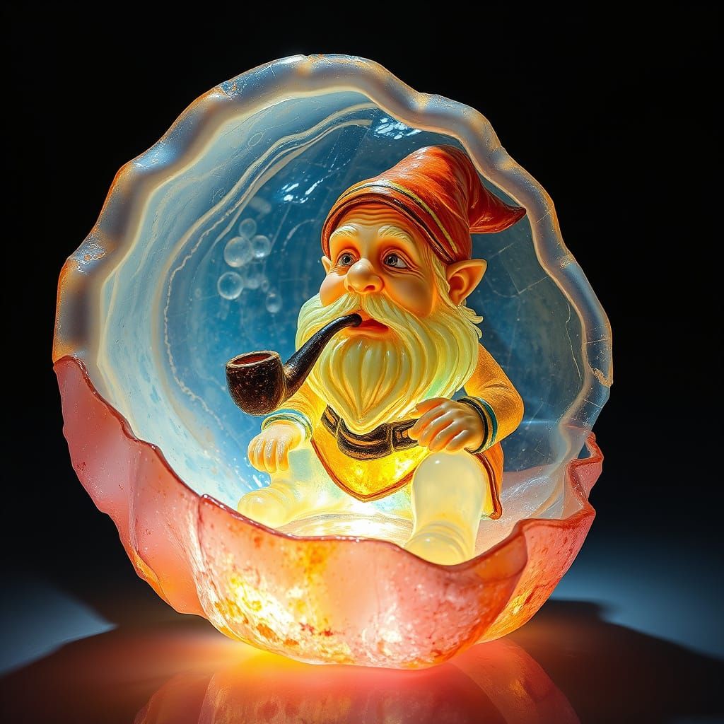This image showcases an intricate sea glass sculpture of a dwarf smoking a pipe inside a shell. It features dynamic lighting and textured surfaces, rendered with thick, colorful paint layers in a neo-impressionist style.
