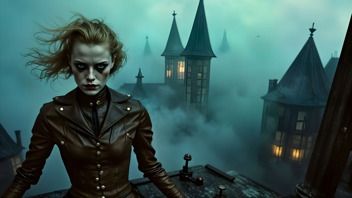 A striking picture of a handsome, muscular WWI sailor jumping from a rooftop in a steampunk town. This cinematic image features film grain and dramatic, post-processed lighting.