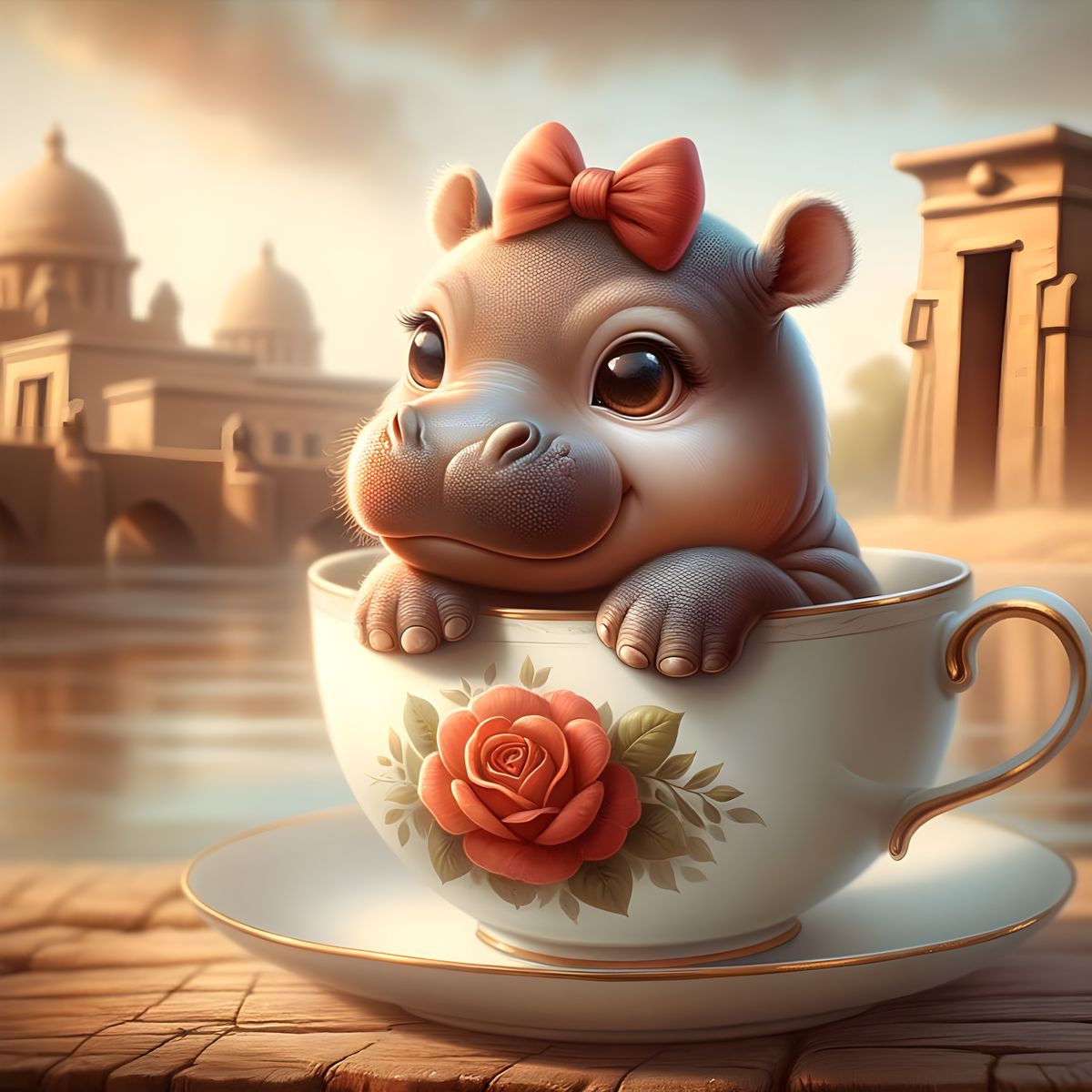 A charming baby hippo in a rose-decorated teacup, set against a blurred backdrop of the Taweret temple on the Nile. Rendered in a tender, light-filled style like pre-1912 art.