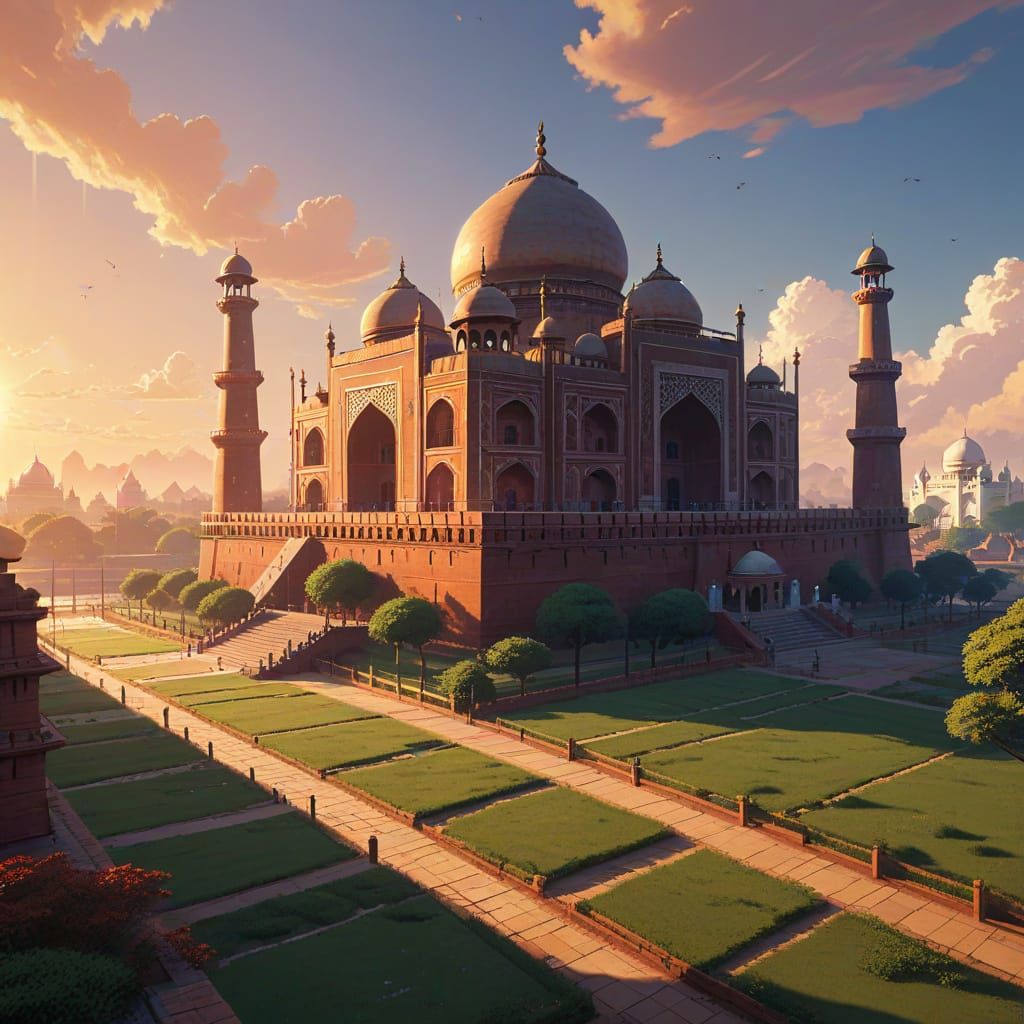 This image shows the city of Agra, India, featuring the Taj Mahal mausoleum and red sandstone fortress. The artwork is reminiscent of Studio Ghibli animation with vibrant colors and intricate architectural details.