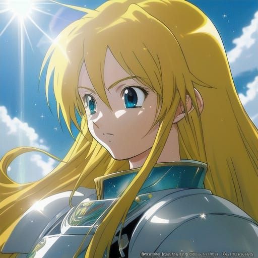 This image shows a female paladin in white leather armor in a barren landscape. She has striking aquamarine eyes and flowing golden hair, depicted with vibrant colors and dynamic lighting in an anime style.