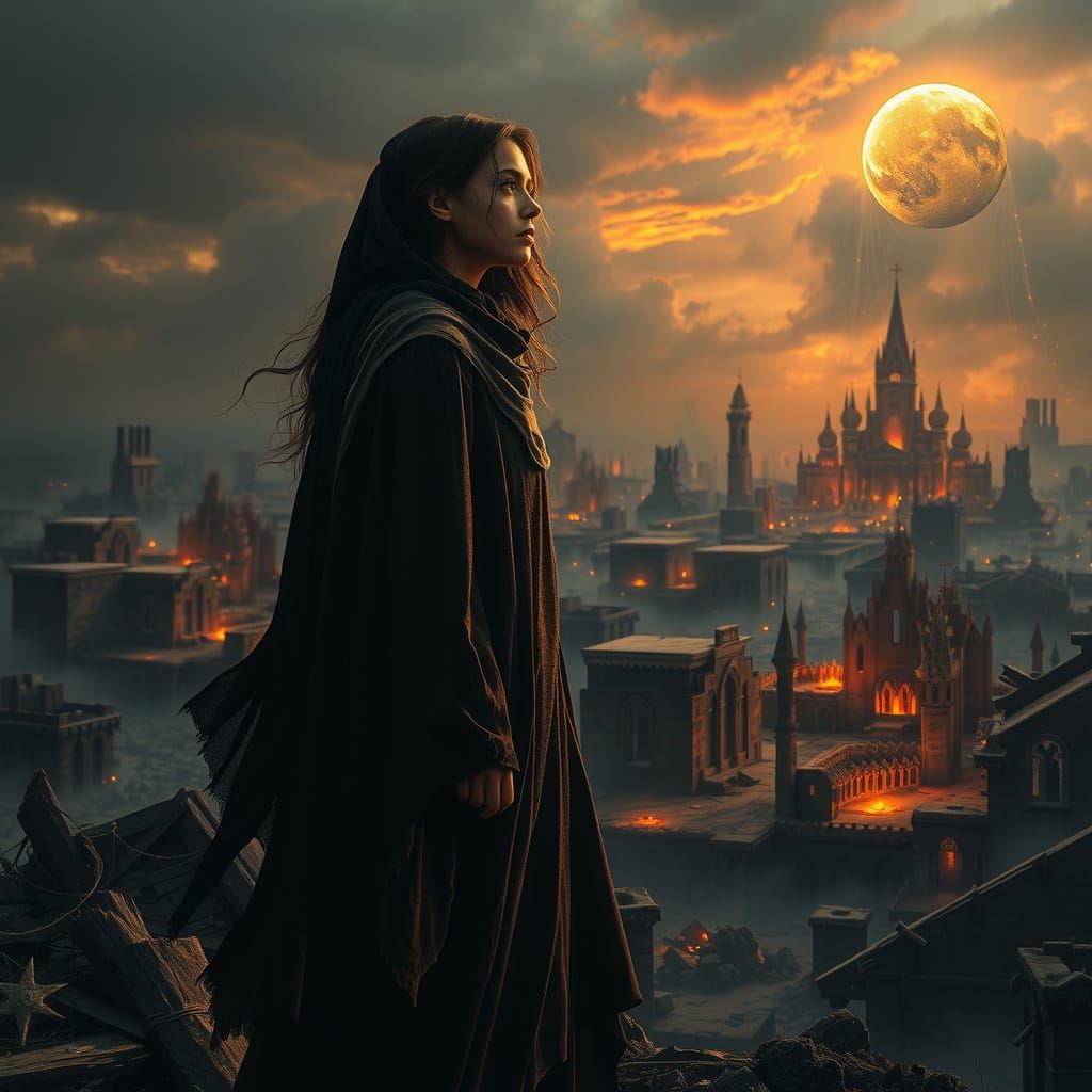 A poignant image of a lone woman standing strong amidst a war-torn cityscape, surrounded by shattered dreams and broken hearts, with a warm golden light and subtle ethereal aura, rendered in a rich, detailed matte painting style with deep crimson and indigo hues.