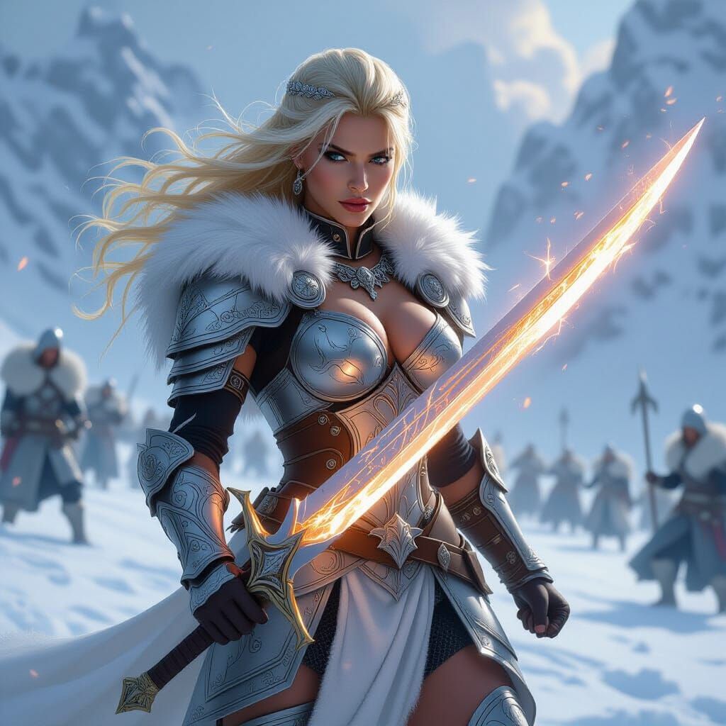 A striking picture of a valkyrie warrior on a snowy battlefield, blonde hair blowing as she holds a glowing sword. This image features heroic fantasy art with photorealistic rendering and dynamic action.