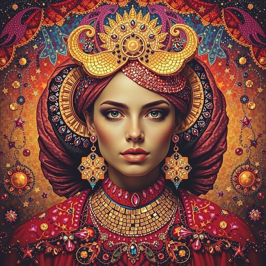A mosaic artwork of a woman with iridescent colors rippling across her skin, set against a starry night sky. The scene is rendered with maximalist detail and avant-garde flair.