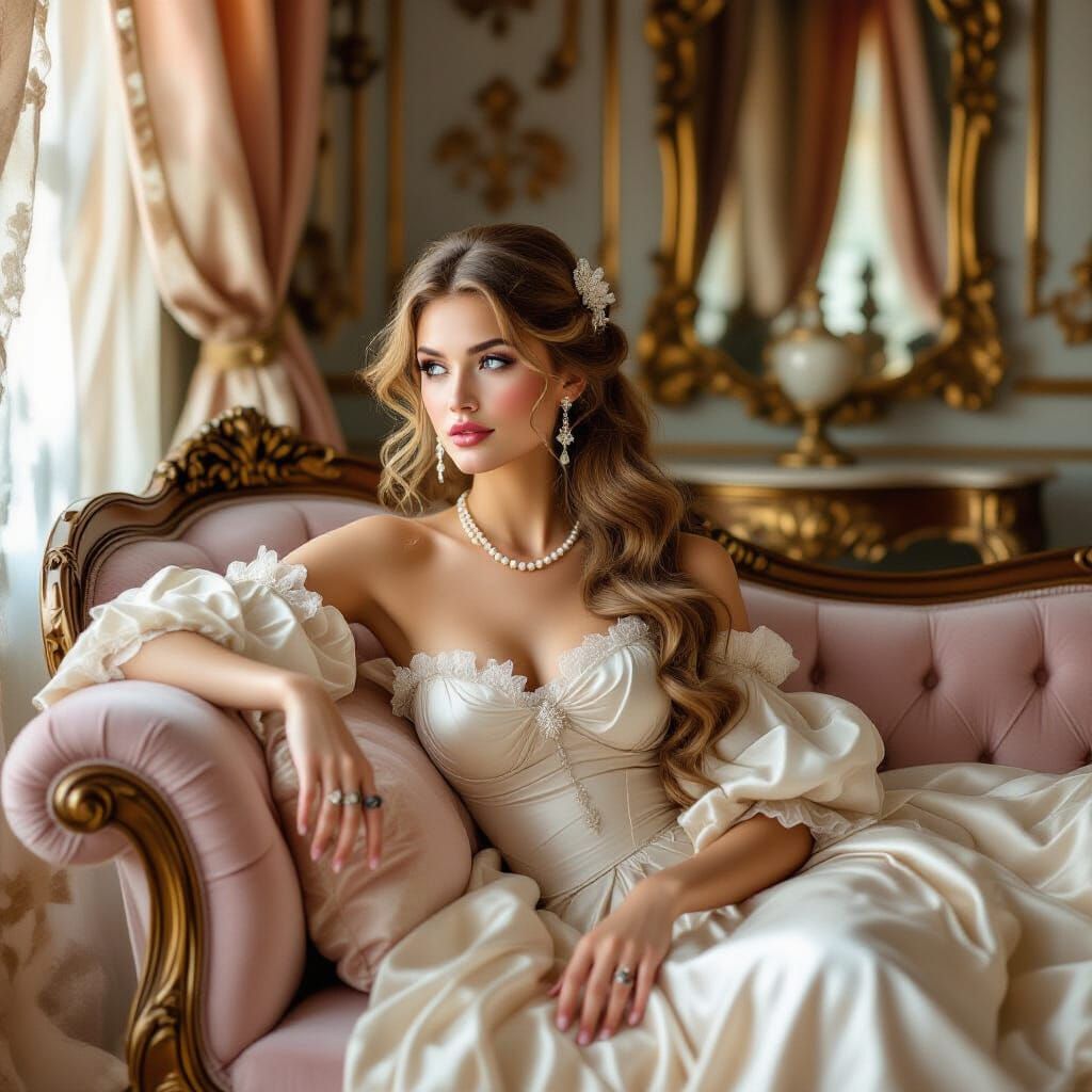 A woman with long golden hair rests on a chaise lounge. She is surrounded by antique furniture and silk drapes, illuminated with soft light. The artwork is in the style of Rococo art.