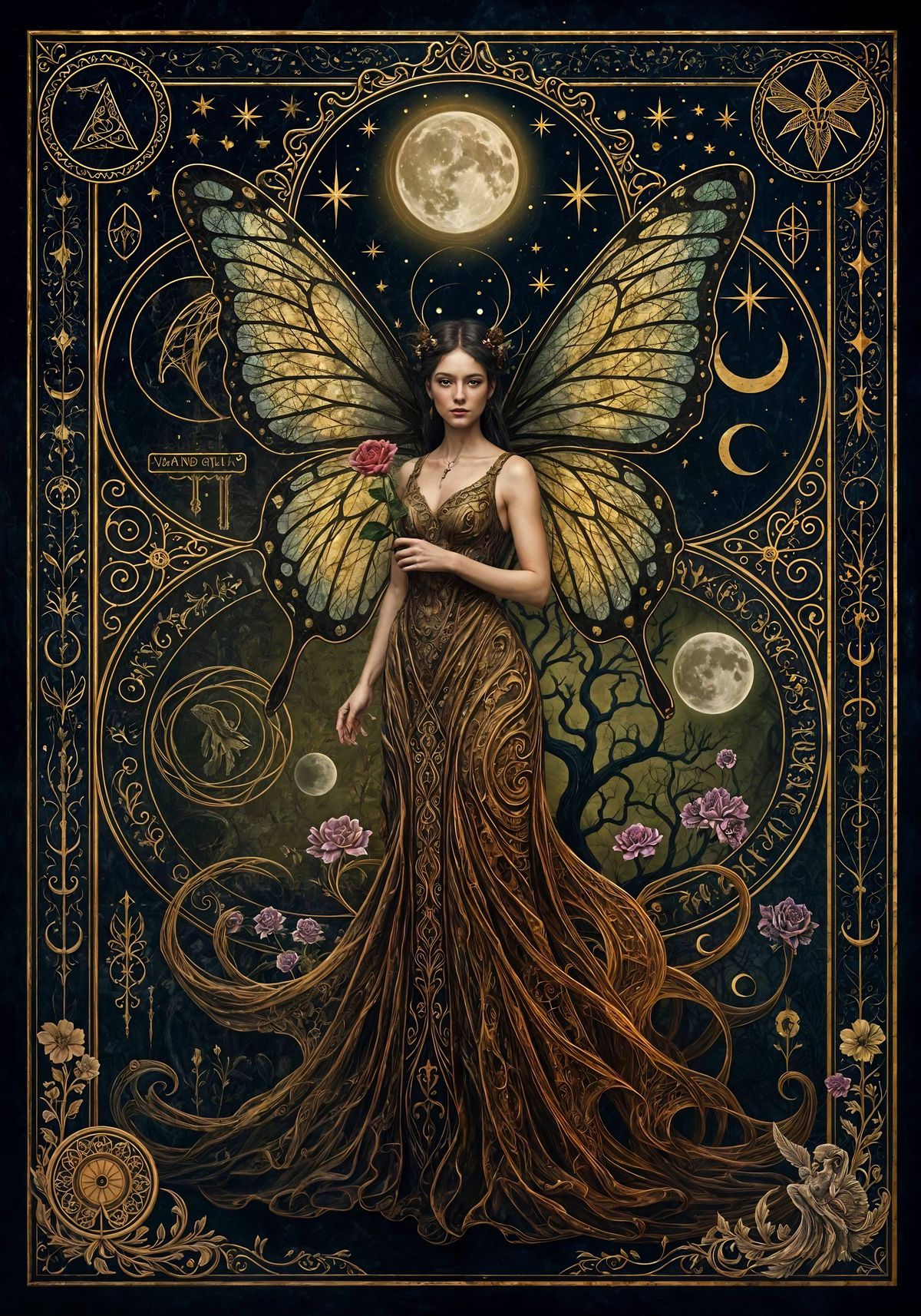 This image shows a fairy queen with butterfly wings in a dark fantasy setting. Rendered with painterly realism and gothic surrealism, the artwork features faded ceremonial motifs and a rich color palette.