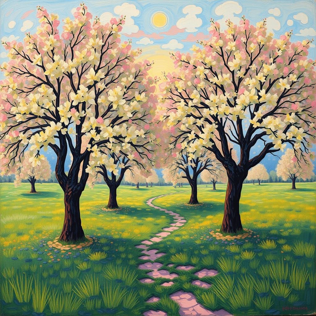 A serene landscape featuring cherry blossom trees at sunset, rendered in an impressionistic style. The artwork captures the soft, warm colors of twilight.