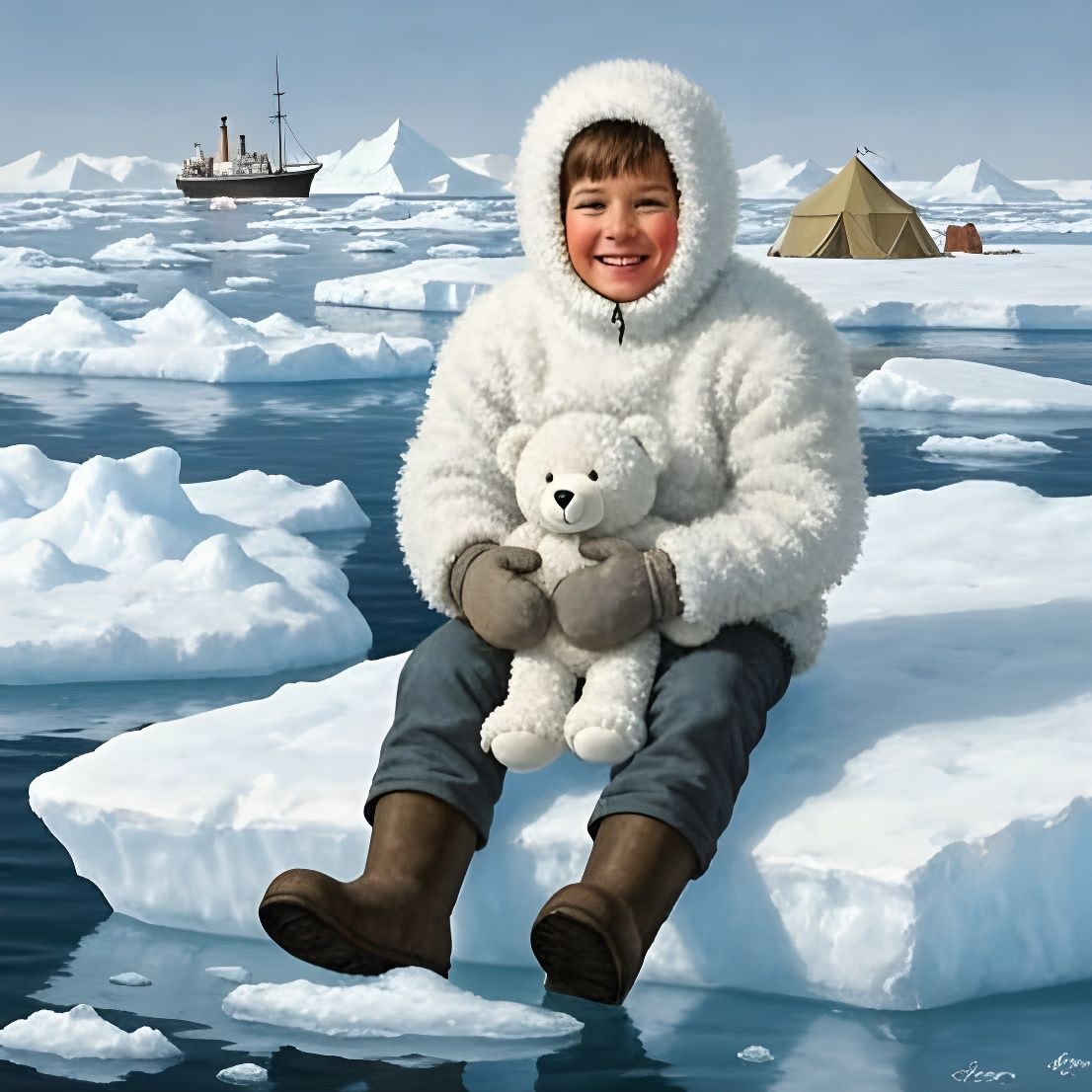 This image shows a smiling child with a teddy bear sitting on a floating iceberg in Antarctica. A distant ship and tent are visible on the icy shore in this detailed, cinematic oil painting.