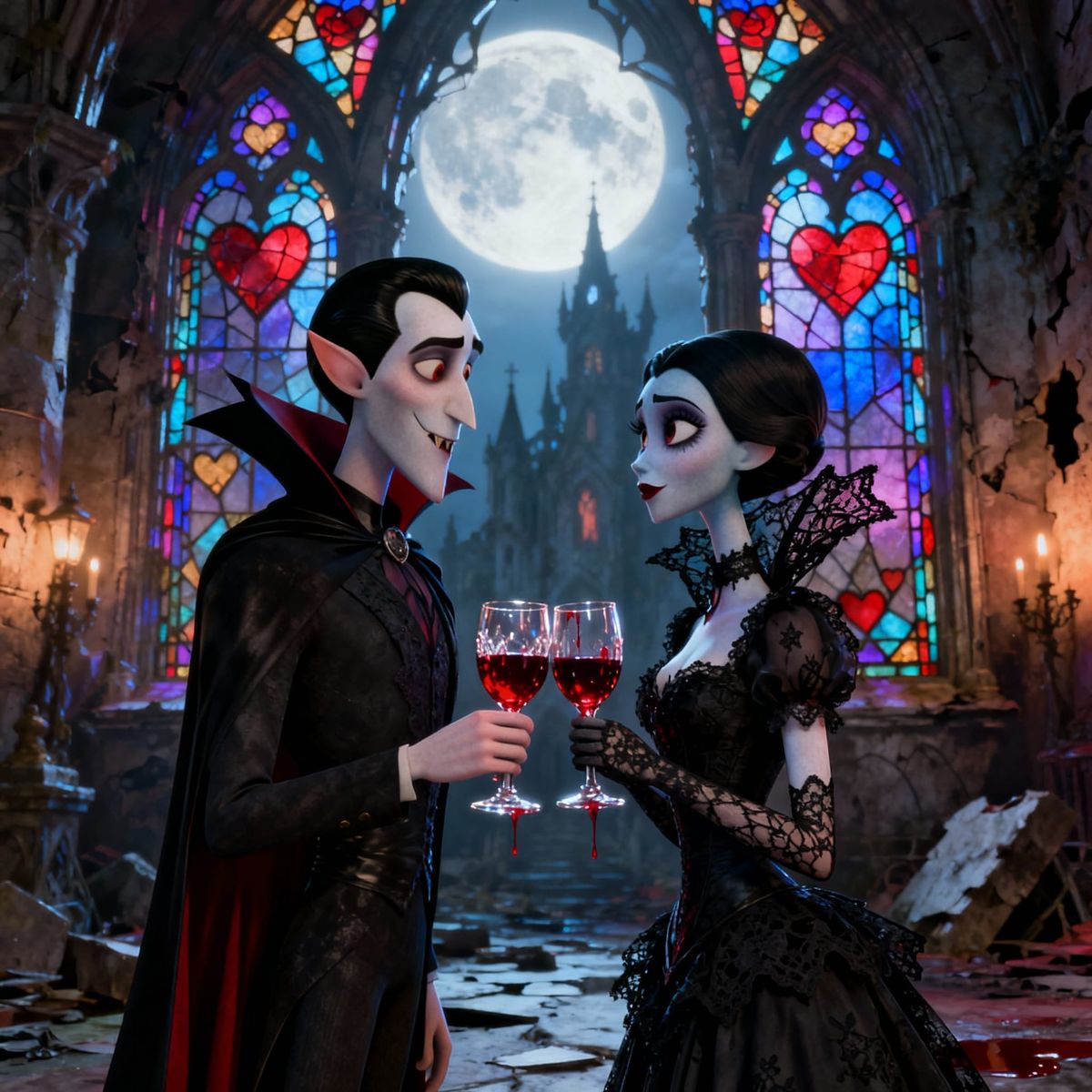 A charming 3D cartoon of vampire lovers in a gothic castle on Valentine's Day. Moonlight illuminates wine and blood in crystal glasses, with elegant lace attire. Rendered in a whimsical, romantic Disney animation style.