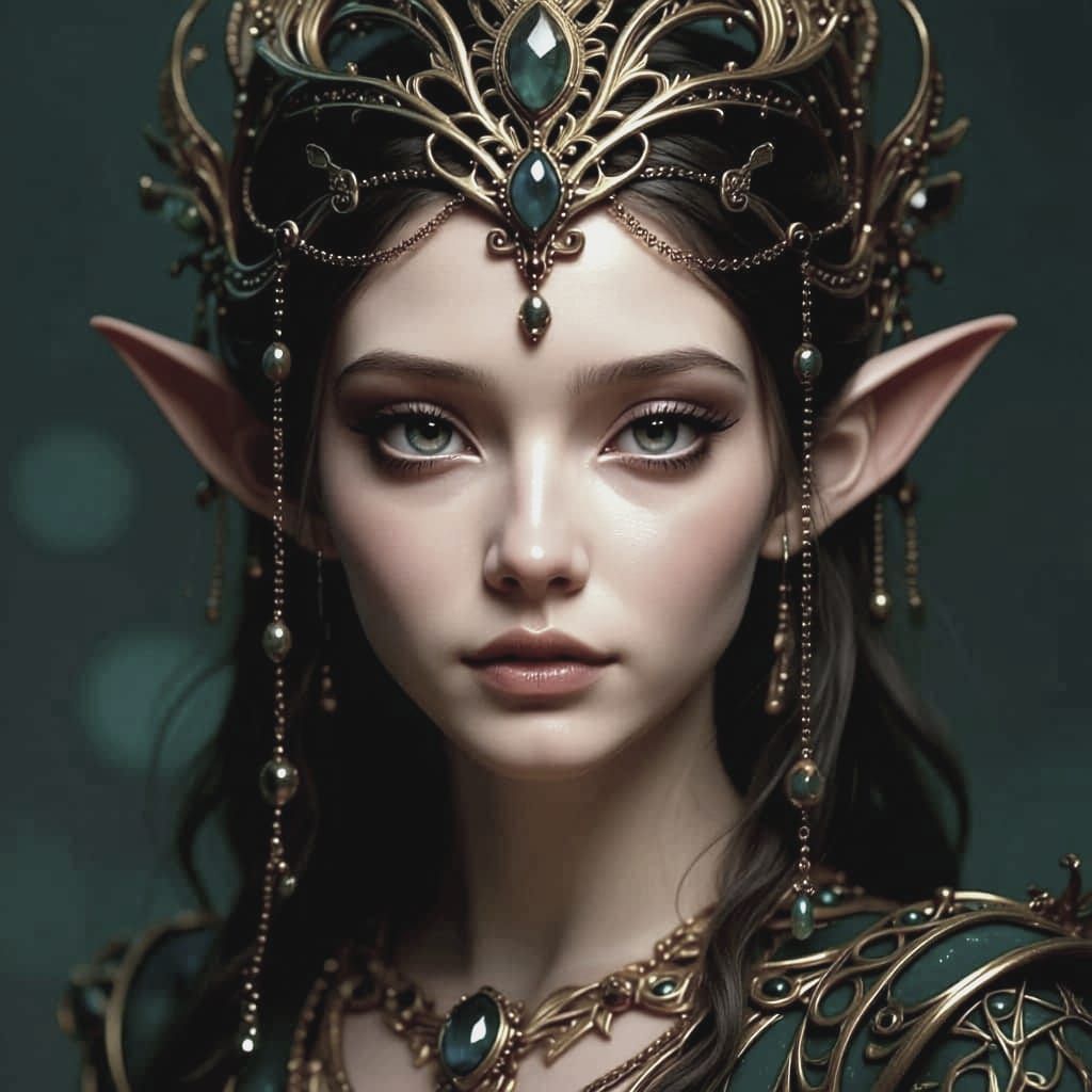 mesmerizing portrait of a fantastical character with ethereal, elfin features and a regal presence. The figure’s face is delicately sculpted, with large, expressive eyes that shimmer with mystery and wisdom. Pointed ears peek through a cascade of soft hair, while an elaborate headdress crowns the character’s ...