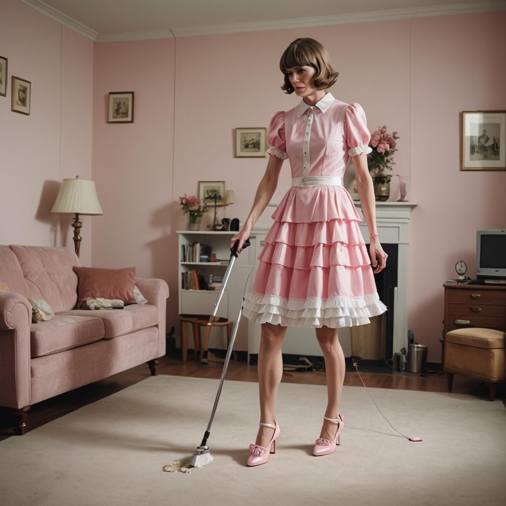 This image shows a striking, cinematic scene of a strong, masculine figure in a feminine, frilly dress, standing out in a living room setting. The atmospheric lighting and film grain add to the dramatic feel.