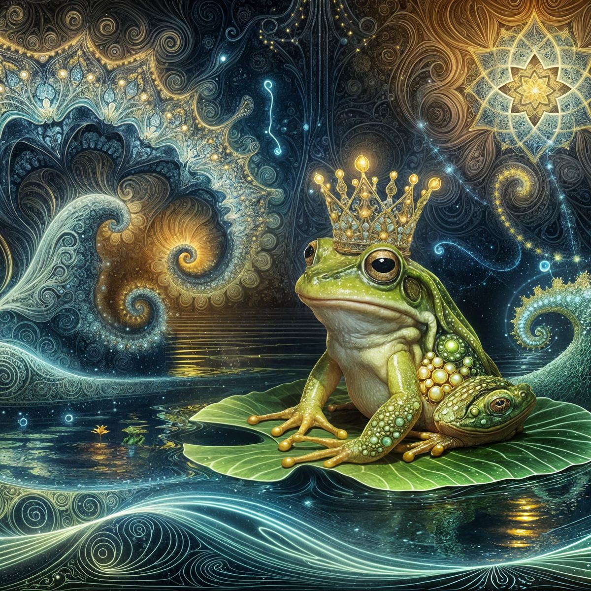 This image shows a frog prince wearing a crown on a lily pad in a glowing pond. Abstract fractals and Zentangle patterns create depth, reminiscent of early 20th-century illustrations.