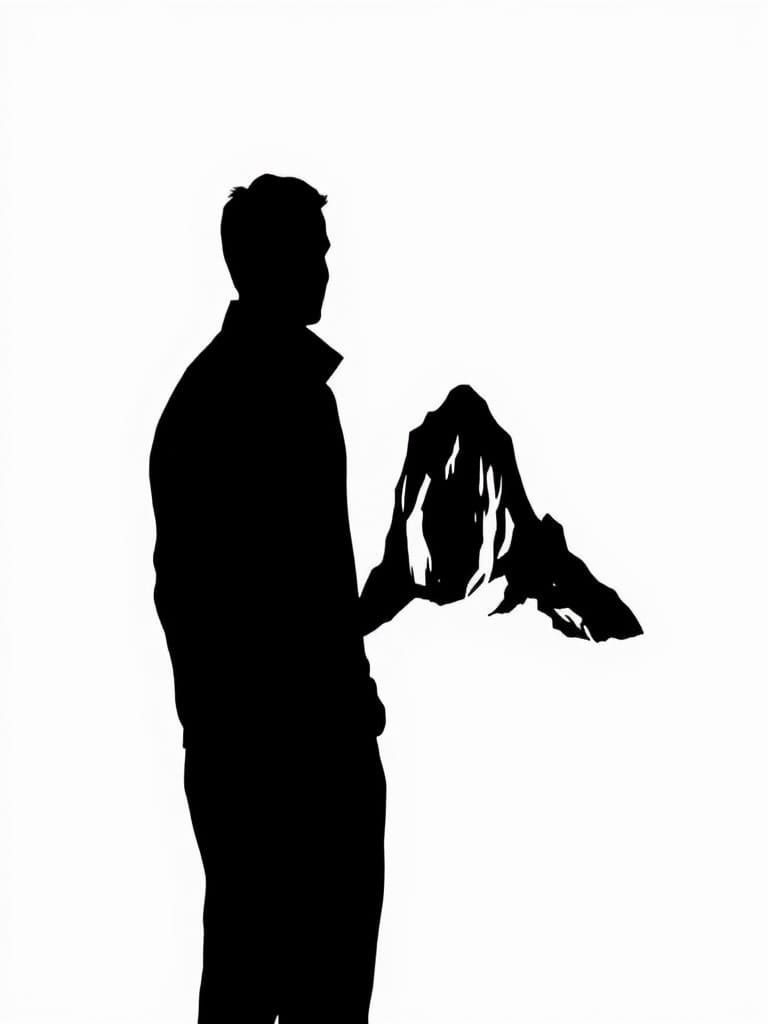 This image shows a dark silhouette of a man gazing at a massive rock formation. The composition features a clean white backdrop and a minimalist aesthetic, with geometric shapes.