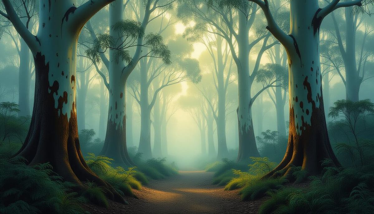 This image shows an Australian gum tree forest veiled in a soft, glowing mist. Ancient trees and winding paths fade into the atmospheric haze, evoking a mystic and romantic mood.