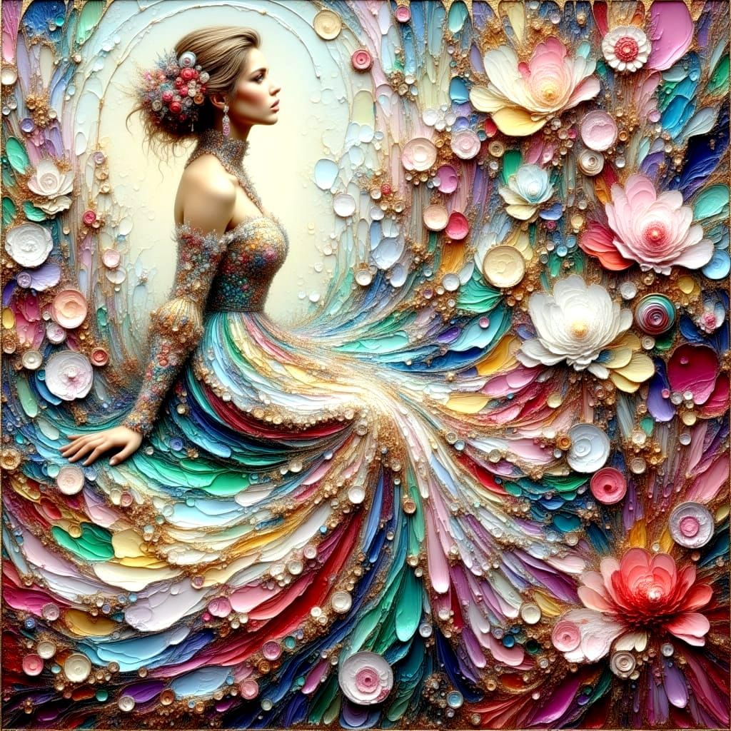 This image shows a beautiful, textured oil painting of a lonely girl in a serene garden setting, with a mix of bright, clashing colors and subtle metallic effects, created using an impasto technique with hard brush strokes.