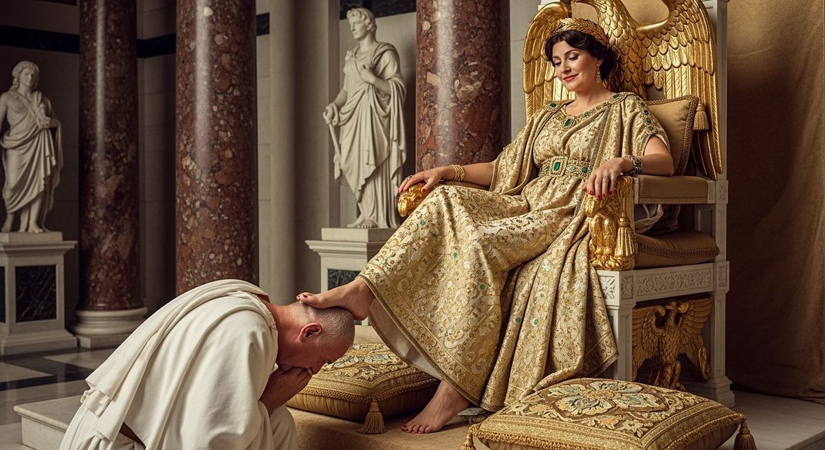 This image depicts Empress Messalina on a marble throne, adorned in gold. A Roman senator kneels before her as she presses her foot on his head in this photograph with natural lighting.