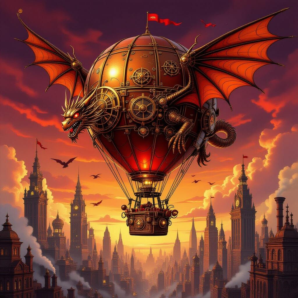A striking picture of a steampunk dragon airship flying over a city. The fantastical scene features brass and copper details, crimson skies, and steam-powered vehicles in a steampunk aesthetic.
