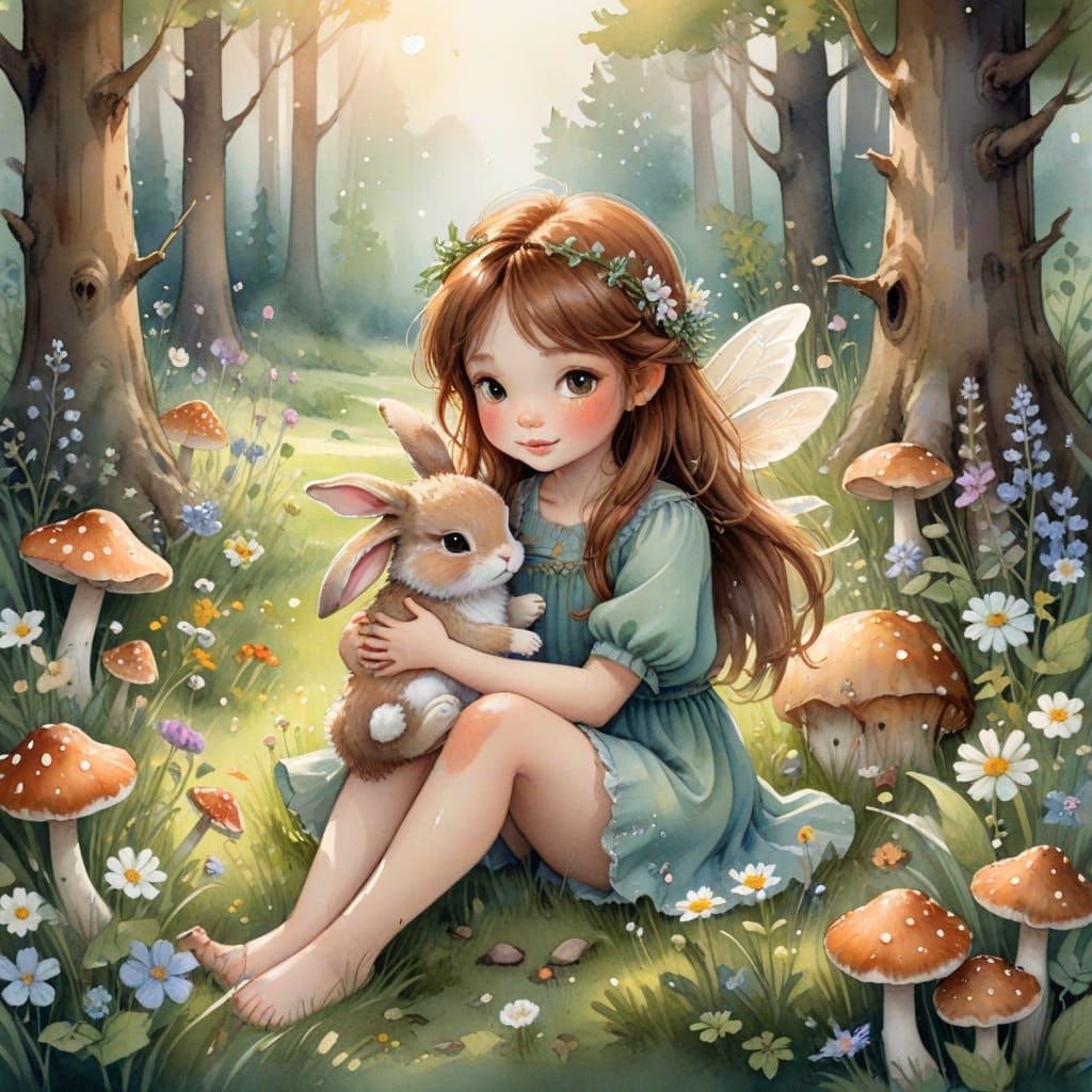 This image shows a charming watercolor illustration of a fairy with brown hair holding a fluffy bunny in a forest setting. It features gentle brushstrokes and warm pastel colors, evoking a whimsical woodland mood.