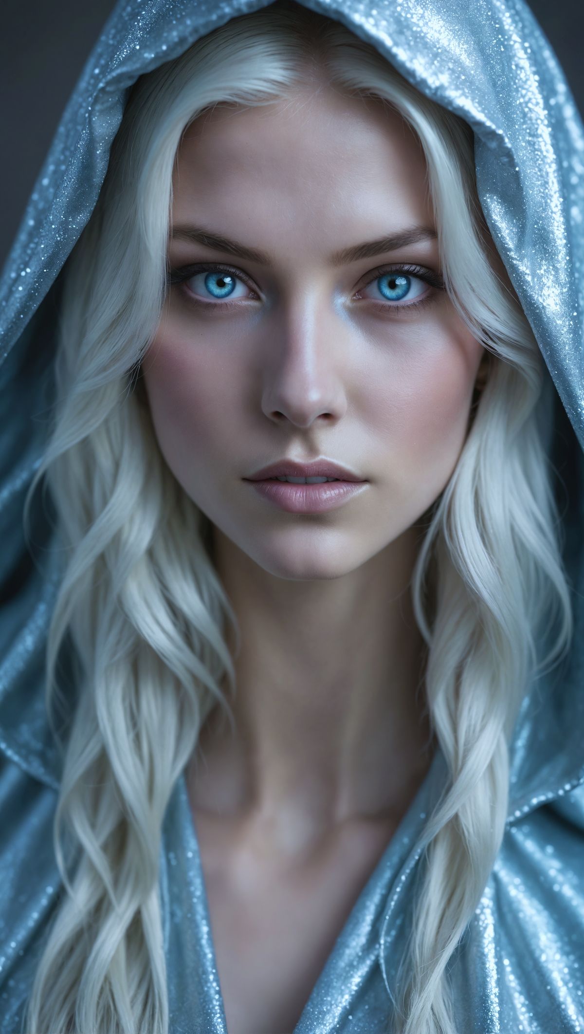 A captivating portrait of a woman with piercing ice-blue eyes, wrapped in a shimmering metallic-blue cloak, set against a backdrop of soft, ethereal light and subtle shadows.