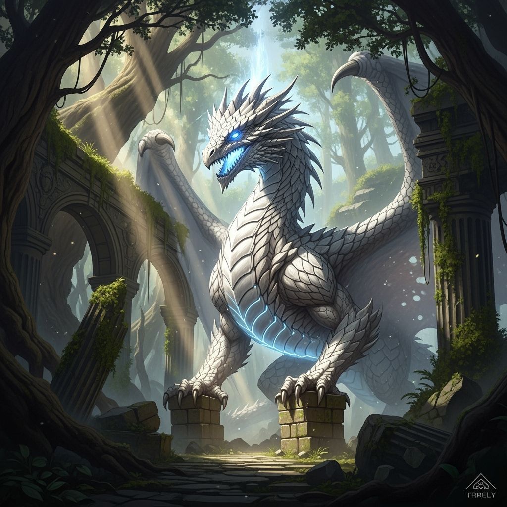 This image shows a colossal white dragon with plated scales and bright blue eyes standing amidst overgrown ruins. Sunlight filters through the primeval forest, creating a mystical realism with futuristic detailing.